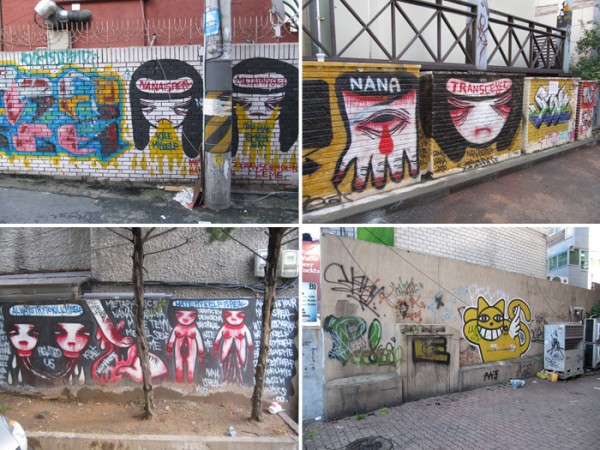 동네 강아지들이 자기 영역을 표시하듯 정말 홍대 전역에 이런 표식이 되어 있다.